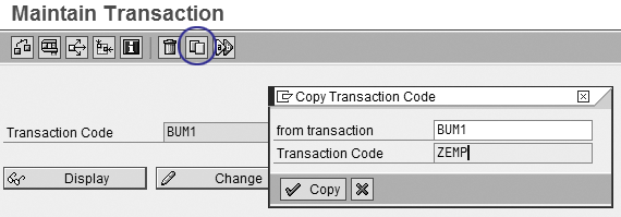 I’ll use BUM1, Create Employee (BP), as a template to make a new ZEMP transaction. Go to transaction SE93, enter source transaction BUM1, and click on the copy icon to open the copy dialog box (Figure 4). Enter the transaction code you want to copy (in my case BUM1), then give the new transaction code a name (in my case, ZEMP). When you copy the transaction, the system copies over the data to create a business partner with limited options for the business partner role.