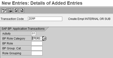 Now that you have a new SAP transaction, you need to customize it to call out just your business partner role category. Follow IMG menu path Cross-Application Components>SAP Business Partner>Business Partner>Basic Settings>Business Partner Roles>Define Application Transactions and click on the New Entries button to access the details screen in Figure 5.