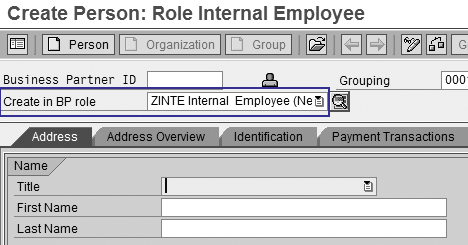 By using these transactions as a starting point, the system assigns an underlying ABAP object that by default bypasses the normal BP transaction GUI where you have to select a person, organization, or group. When you bypass the normal BP transaction GUI, you can use your custom business partner roles instead of the standard business partner roles, such as Business Partner General. In my example, the system proposes the ZINTE business partner role as the default business partner role when you link the new transaction code to the new business partner role category.