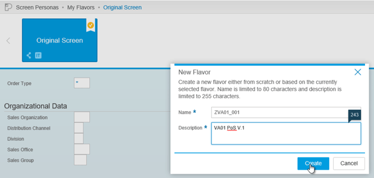 At this stage, you make adjustments in the Create Sales Order screen. To start, continue the changes on My Flavors: ZVA01_001 located at the top of the Screen Personas solution. Select My Flavor. (My Flavor is used for variants that are made to the SAP Screen Personas 3.0 layout.) Click the pencil icon