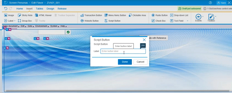 You need to continue to modify flavor ZVA01_001. Select this flavor and click the edit icon. In the menu of the screen that appears, click Insert and then click the Script Button. In the Script Button pop-up screen, enter a name for the script button in the Label field (for my example, enter Material KIT A1). Click the Done button.