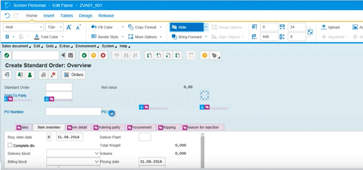 to modify the flavor. The first change in the Create Standard Order screen is that you do not use the tabs. In the Sales document screen hide the Item Overview, Item Detail, Ordering Party, Procurement, Shipping, and Reason for rejection tabs. Click the title of each tab and select the following tabs: Tab: Sales, Tab: Item, Tab: Details, Tab: Ordering Party, Tab: Procurement, Tab: Shipping, and Tab: Reason for Rejection. Click the Hide button on the top bar. This hides the selected tabs (Figure 5).