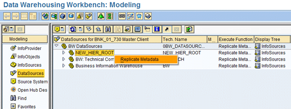 Under the DataSources menu in transaction RSA1, select the BW DataSources node where you created the new DataSource. Right-click the DataSource and select Replicate Metadata from the context menu (Figure 3). This process replicates the DataSource along with the extract structure into the SAP NetWeaver BW environment for further use in mappings and transformations.