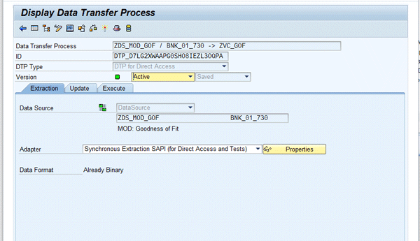 Then create a new data transfer process (DTP) using Synchronous Extraction SAPI for the adapter type. Right-click the Virtual InfoProvider again and select Create Data Transfer Process. This takes you to the Display DTP view in Figure 6.
