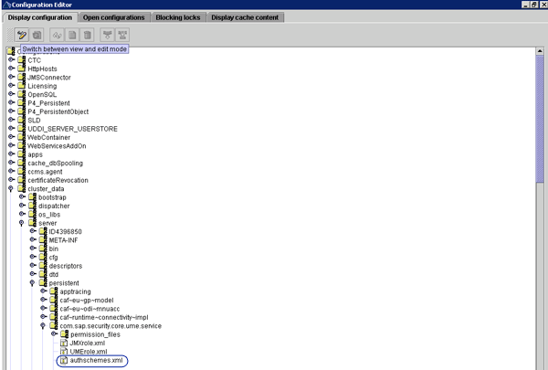 Step 2. Download the authschemes.xml file from offlineconfigeditor, which you can locate at usr/sap/SID/JCxx/J2EE/configtool/offlinecfgeditor.bat (Figure 2). The authschemes.xml file controls the authentication schemes used for logon. Replace the name of the standard logon PAR file with the name of your PAR file.