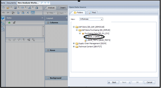This brings up the data source selection panel. Assuming that a connection to your BW system had already been set up by the system’s administrator, you can see all the activated and custom InfoAreas from which you can select an existing query