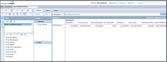 For this example, let’s select query ZBOE_1 in the purchasing (materials management) area. As soon as you do that, Analysis defaults in an aggregated view of the result set as shown in