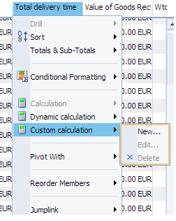 As an example, consider the following business need: An analyst wants to see the difference between the ordered quantity in a purchase order and the goods receipt quantity. Let’s see how easy it is to do this. Place your cursor on the Total delivery time column and right-click to generate the context menu. Choose Custom calculation and then New (