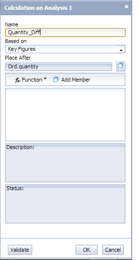 For this example, name the field Quantity_Diff and accept the default selection for the Place After field. Now let’s add the operators and the operands. To select an operand, click the Add Member button. This generates another pop-up that lets you select members on the right (