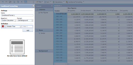 Reason 7 — It is easy to create alerts and exceptions. Generally, BEx users have commented favorably on the ease of creating alerts and exceptions using conditional formatting. One business user at a large SAP customer said she thinks that conditional formatting in Analysis, edition for OLAP is “alert and exception creation at its convenient best.” Let’s review a simple example with a sample report. Suppose you want to highlight those records with invoice amounts greater than 10,000 Euros. First, click the Conditional Formatting button in the top menu. Doing so opens a window on the left, in which you set your exception threshold