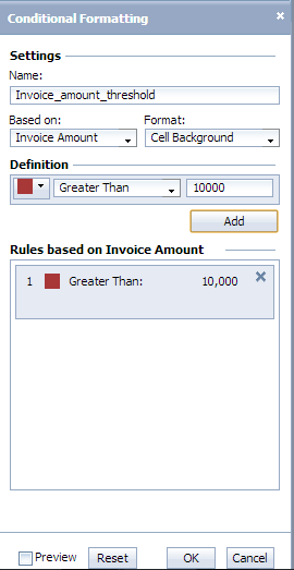 Give the condition a descriptive name. Choose the appropriate field on which this condition is based from the Based on drop-down menu. In this case, it is Invoice Amount. You can select from three options in the Format field: Cell Background, Value, and Symbol. You can test the effect of each of these options, but for this example, I prefer the Cell Background. Next, define the condition by choosing the color, the operator (in this case it is Greater Than), and the threshold. Click the Add button when you are done (
