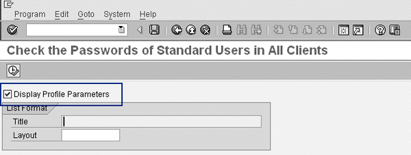 When you execute the report, there’s a check box labeled Display Profile Parameters (Figure 1). When you check this box, the system displays all the profile parameters that I mentioned earlier and their values. (To keep things straight and simple, let’s just disregard the Title and Layout and run the program as it is).