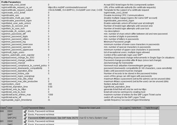 The display splits into two panels (Figure 2). The top panel provides information about all the profile parameters and the bottom panel provides information on passwords of system users.