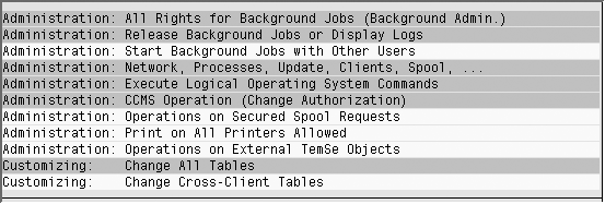 Both internal and external audits often use a dump of the results to get a listing of the critical authorizations that each user has in a particular SAP system. Examples of authorizations that are deemed critical by SAP are administrative rights for running background jobs — Administration: All Rights for Background Jobs (Background Admin.) — and the ability to change customizing tables — Customizing: Change All Tables (Figure 3). Note that this is not a complete list of all authorizations that each user has, but only the critical ones. It is a good starting point if your auditor is interested (initially) in the list of critical authorizations. The information provided by this report enables auditors to analyze why a particular user has been given a particular authorization. Often, the need for operational efficiencies creates a situation wherein the system copies roles and profiles from one user to the next. This can cause inadvertent granting of inappropriate privileges to certain users. For example, the system should only grant authorization to execute logical operating system commands to Basis or SAP NetWeaver administrators. This report tells you which of the users (including the non-Basis ones) have the authorization to do so. You can quickly spot these anomalies and take corrective measures.