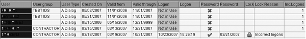 I intentionally blanked out the values in the User column for security reasons. I also used SAP List Viewer functionality to reduce the number of displayed fields so that they fit into a standard page. From either an operational or audit standpoint, you can see even with a quick glance all users who have attempted to log into the system that you are checking, albeit unsuccessfully, including those users who are locked. In the screen shown in Figure 4, the user in the last record is locked due to Incorrect logons. For those who are not locked (as is the case with the first four users), display the number of incorrect logon attempts and the date and time of the last logon. Additionally, the list also shows the dates on which each user was created (Created On), the validity period in the system (Valid from/Valid through), and, assuming it got locked, when that happened (Logon).