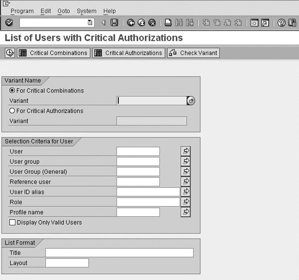 Figure 3 displays a screenprint of the critical authorizations assigned to a particular user in an SAP development system. These authorizations give you the ability to run transactions that can affect the operations of your system. This report does not have a selection screen, and therefore no selection criteria. You just need to execute it.
