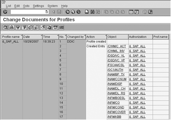 This report provides very detailed level information on changes to profiles. Unlike RSUSR100, this one is driven by profiles. When you execute this report, the system presents you with a selection screen in which you can specify one or more profiles (if you don’t know the profiles, you can press F4 to retrieve them), the user that made the changes, and the date range. Fill in the selection criteria (SAP_ALL for profile name and a particular date range) and run the program to get the output shown in Figure 7.