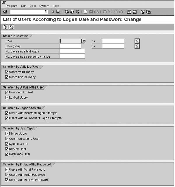 You can provide a lot of specific information to narrow down your search, such as date and time range for changes to one or more users. You can control the output of the display. Furthermore, you can choose to display authorization-related changes to one or more users by selecting one or more of the check boxes in the Selection Criteria for Changed Authorizations section. If you keep all the boxes in this section unchecked, the output lists all password, user-group, and validity-date changes, but no authorization-related changes. This information can be a key component of a security audit. The output of this report is not displayed due to the sensitive nature of the information.