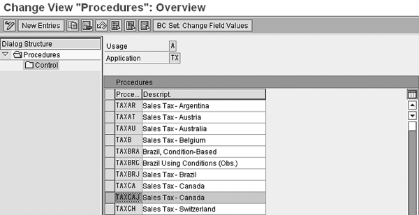 This scenario assumes that the country assignments to tax procedures have been made as follows: Country US: TAXUSJ and Country CA: TAXCAJ. You can check transaction OBBG to make sure that this is the case.