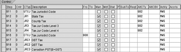 Step 7. Enter Canadian and US tax conditions into the SD pricing procedure. This is needed for the system to pick up the appropriate tax procedure during billing, as long as the relevant conditions have been met. If you have already been including sales tax in invoices to US customers, then you most likely already have a US tax condition set up here. In transaction V/08, I’ve entered tax conditions UTXJ and CTXJ as well as tax jurisdiction levels such as JR1, JR2, JRC1, and JRC2 into the SD pricing procedure (Figure 14).