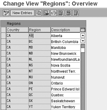 Step 2. Insert Canadian regions into the US. For the intercompany transactions between the US and Canada to work successfully, treat the Canadian regions as if they are part of the US. However, be certain that the two- digit code that represents the Canadian region is not already defined as a US region. In the standard SAP system none of the Canadian regional codes clash with the US codes. Go to transaction OVK2 and scroll down to country CA (Figure 4).