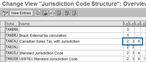 Step 3. Set up a Canadian tax jurisdiction structure similar to the US structure. This allows the tax rates to pull the correct jurisdiction code structure (state, county, and city) for Canada as it does for the US. Go to transaction OBCO and change the structure for Canada (for example 2, 3, 4) to match that of the US (Figure 6). The numbers 2, 3, and 4 in the Lg columns represent the number of characters of the first, second, and third hierarchy levels of the tax jurisdiction structure. Taking an example in the US, for a jurisdiction structure NY0010001, NY (two characters) can represent New York state, 001 (three characters) can represent Westchester County, and 0001 (four characters) can represent the city of White Plains.