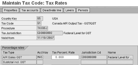 Press Enter, give the Tax Code a description and type, and scroll down to the part of the screen that contains the part of the Canadian tax procedure (A/R Sales GST) that you entered in the first step. Then enter the rate for Federal Level for GST, which is 6.000 in this example (Figure 9).