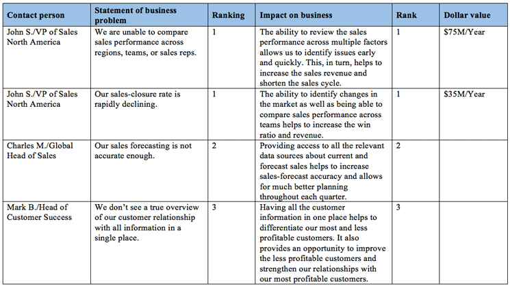 When adding this information, you can use a scale of one to 10 or from one to five to rank the business problems against the first two questions. If you can actually place a true monetary value on the problem, even better.