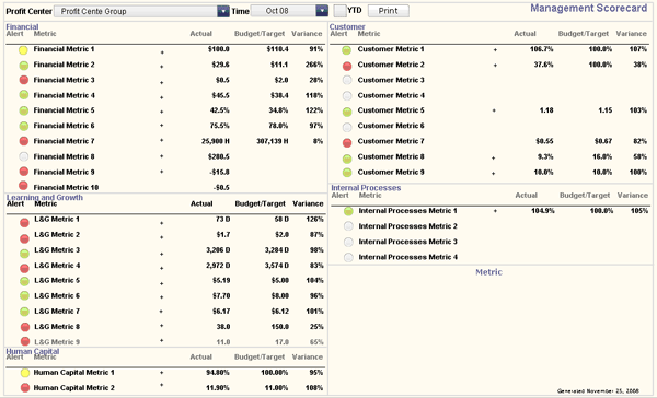 A management scorecard provides a broad overview of a company’s performance by comparing its results against internal goals or external benchmarks. Management teams can then use this information to help evaluate their performance and assess which areas may need additional attention. Unlike a comprehensive solution such as the Balanced Scorecard — which aligns with the company’s strategies and integrates with goals, initiatives, and value drivers to gain the benefits of managing your business with dashboards — the management scorecard typically highlights problems, but does not reveal the root cause drivers for further exploring and addressing the issues.