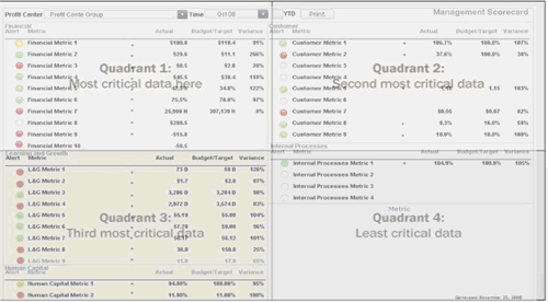 Because of ongoing time pressures for many executive teams, it is critical that the scorecard be well designed so that it is intuitive to use and efficiently communicates information. Ideally, executive users need to be able to scan the scorecard in less than a minute to get an overall understanding of the business and may spend another two to three minutes looking at specific issues. With these time constraints, it is critical that the scorecard design is both concise and precise.