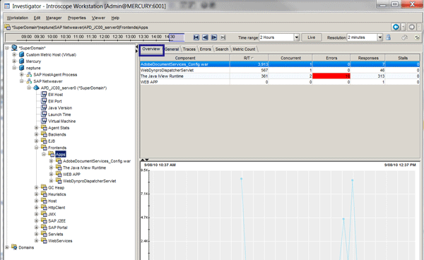 The Overview tab consists of a combination graph for the node selected, along with a summary of component runtime information, response times, errors, and stalls (Figure 10). Note that a node is a logically related collection of Wily performance metrics. From the SuperDomain node level overview, most selected nodes offer additional tabs.
