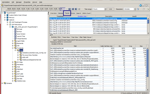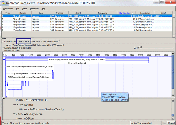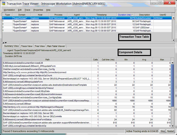 The Transaction Trace table in Figure 17 allows you to further analyze trace details. By default, the trace starts in the Summary View, which displays the summary information for each component of the selected transaction. By selecting an entry from the trace table, you can sort the table and check the summary view for the most expensive part of the response time. Double-clicking the appropriate record in the Summary View takes you directly to the closest node in the Investigator View.