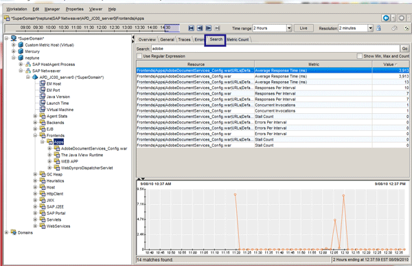 Select the Search tab to search for all metrics matching your input text or regular expressions (Figure 14). Results are presented in a single table. Double-click a row to jump to the appropriate node in the Investigator tree. A single click from the table displays the associated graph in the bottom pane.