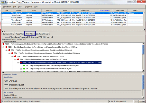 The Tree View displays a traffic light hierarchical view of the transaction components (Figure 19). Red represents a total duration of greater than 25%, yellow represents a total duration of greater than 10%, and green represents a total duration of less than 10%. The color-coded traffic light representation is designed to lay blame directly on the most expensive part of the traced transaction. In the example in Figure 19, the Adobe EJB process was responsible for more than 30% of the total transaction run time.