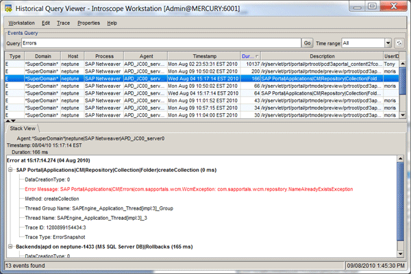 You can see the Historical Query view by pressing Ctrl-Q from the Transaction Tracer view. This screen allows you to create a search query across the SmartStor database (Figure 21). You can use sophisticated wildcards and Boolean logic to combine search terms. Some useful search expressions include (ms), Response, Concurrent Invocations, Errors, and Stall.