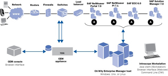 The simple Wily landscape shown in Figure 2 can be scaled out and improved to a mission-critical APM deployment. Introducing a Wily CEM appliance and connecting it to the most appropriate network fabric switch provides all the necessary metrics to begin using the CEM console (Figure 27). Over time, the performance of the Wily APM solution becomes critical and you may need to scale out the solution by clustering the Wily EM infrastructure and introducing an MoM-based landscape. This scale-out process can be performed gradually and without disruption to the existing Wily EM deployment.
