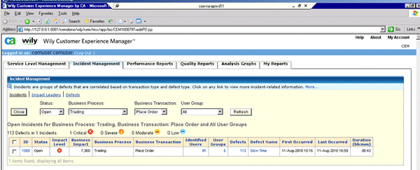 Wily CEM allows the business to understand and respond to the online experience of each end user. CEM monitors individual end user transactions in real time, enabling you to measure service level agreements (SLAs) (Figure 30). It provides a more business-centric approach to dashboards and alerts.