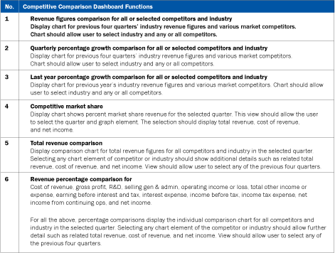 With these guidelines, you can prepare the dashboard design sheet with a list of all the functionalities, possible visuals involved, and the user interactions that operate those functionalities. By reading the guidelines, executives should get a better picture of the functions of the end product. Figure 2 contains an example dashboard design sheet that lists the functionality of a competitive comparison dashboard.