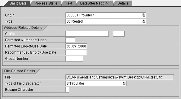 Start transaction CRMD_MKTLIST to test the enhancement. To start file upload you need to add the parameters for the upload. In the Basic Data tab, enter the information shown in Figure 5. For Origin, select the origin of the external list. For the Type, select the list you want to use — in my example this is 02 Rented.