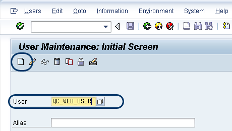 Create this user in SAP Solution Manager by following menu path transaction code SPRO > SAP Solution Manager > Scenario-Specific Settings > Third Party Integration > SAP Quality Center by HP > Integration Test Management. Click the execute icon next to Set Up Technical User for Web Services. This takes you to the user maintenance screen. Specify a user name of your choice and click the create icon (Figure 10).
