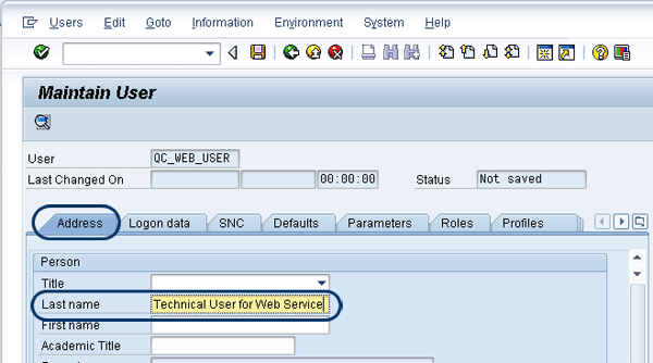 Fill out the Address tab for the technical user
