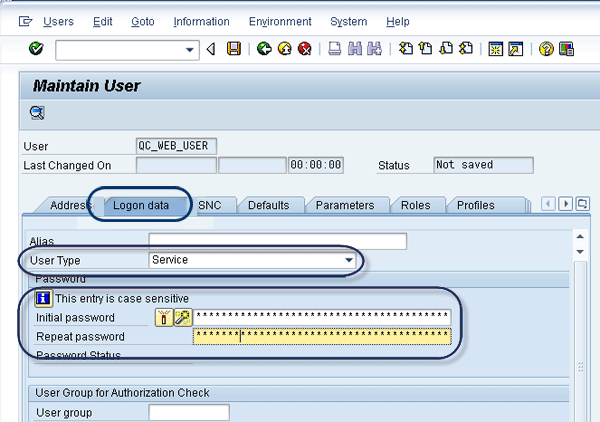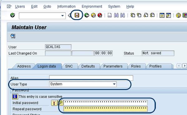 The process for creating this user is similar to the process you just performed for the technical user for Web services. Navigate to SAP Solution Manager > Scenario-Specific Settings > Third Party Integration > SAP Quality Center by HP > Integration Test Management. Once again, click the execute icon next to Set Up Technical User for Web Services. You are taken to the user maintenance screen, where you should specify a user name (e.g., QCALIAS) and click the create new user icon (Figure 14). Similar to what you did before, specify a user name in the Address tab (Figure 15). In the Logon data tab, choose the user type System and set up a password (Figure 16). Save your work.