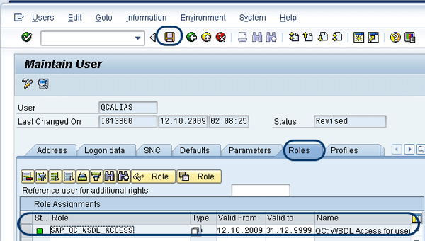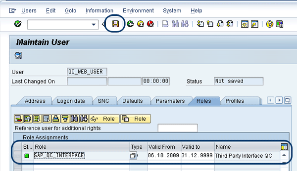 Next, select the Roles tab. Assign SAP role SAP_QC_INTERFACE to your user by entering it under Role Assignments and save the data (Figure 13). You have now set up the technical user for Web services.