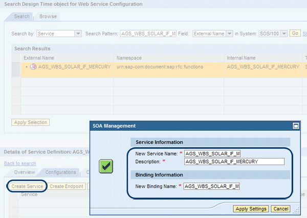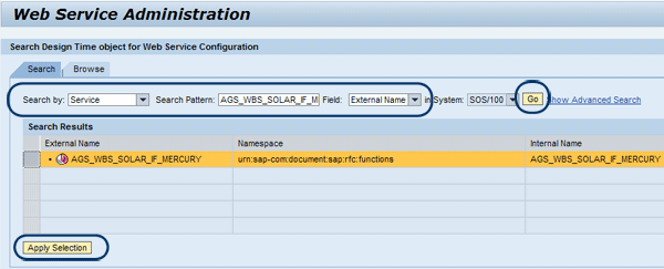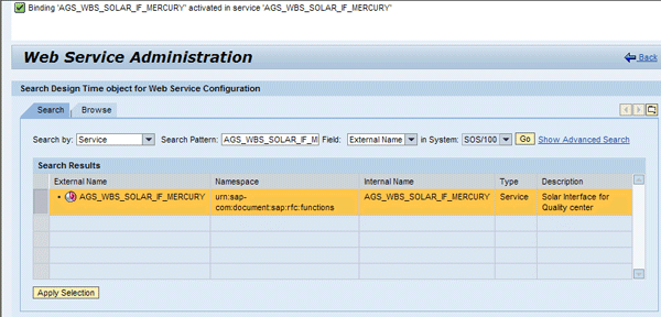 Again, the in System value is defaulted. Start your search by clicking the Go button. Select the External Name AGS_WBS_SOLAR_IF_MERCURY that appears and then click the Apply Selection button (Figure 19).