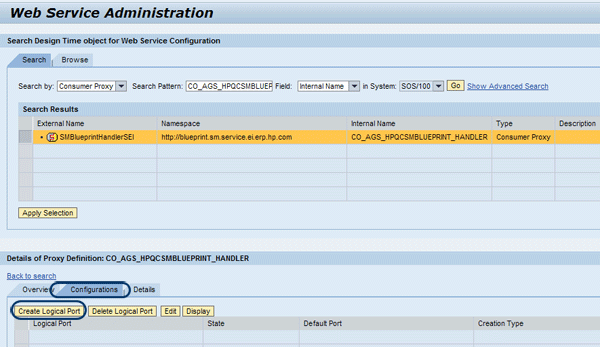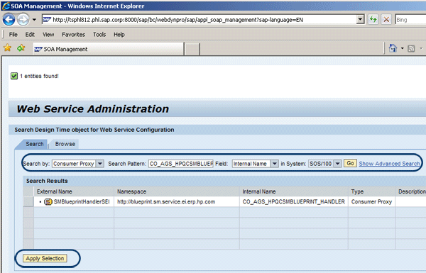 Note that the in System value is defaulted. After entering all the required data, click the Go button to start the search. Select the External Name SMBlueprintHandlerSEI when it appears and then click the Apply Selection button.