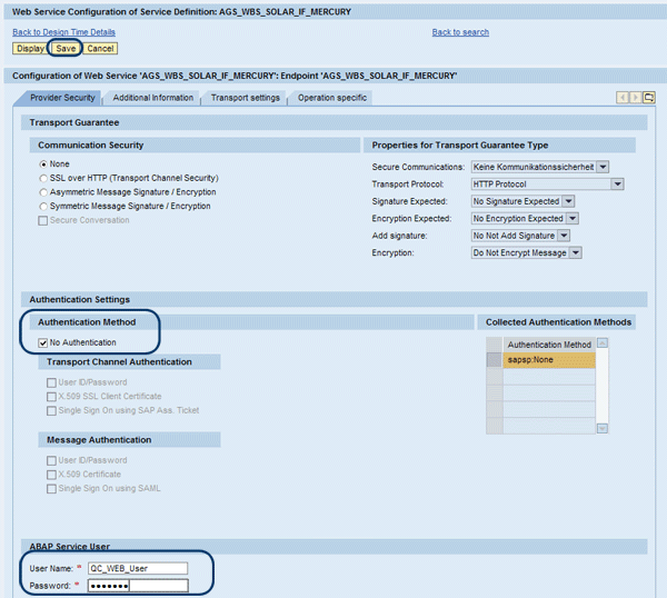 Then, click the Apply Settings button and a Web Service Configuration of Service Definition: AGS_WBS_SOLAR_IF_MERCURY page appears under the Details of Service Definition section (Figure 21). Mark the check box for No Authentication under Authentication Settings. Then enter the user name and password under the ABAP Service User section to assign the technical user you created in the Create Technical User for Alias section (Figure 21, which is an extension of the screen shown in Figure 20).
