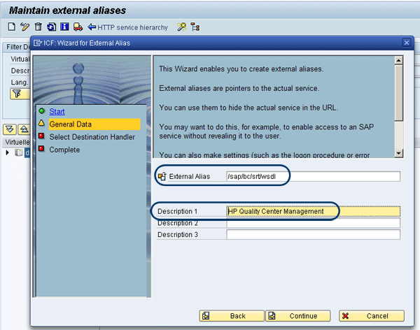 To set up the alias in the Maintain service screen, follow menu path Goto > External Aliases > Wizard - External Alias (Figure 24). To start the external alias service setup with the wizard, click the Continue button (Figure 25).