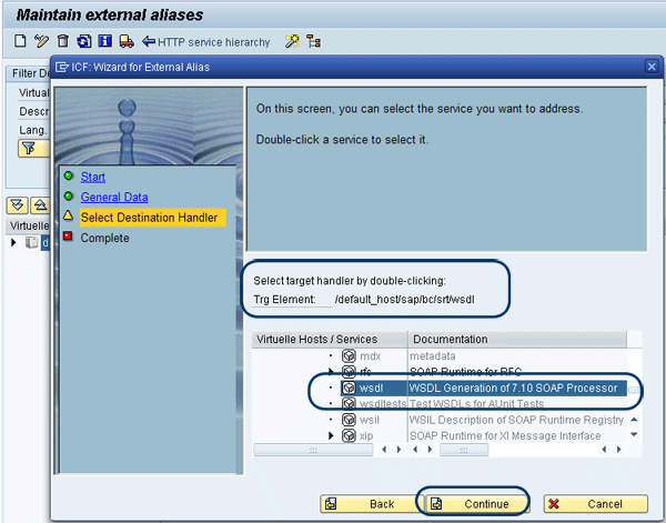 Click the Continue button. In the next screen, Select Destination Handler, select the handler /default_host/sap/bc/srt/wsdl from the Documentation list shown in Figure 27. All the items circled in Figure 27 are required elements.