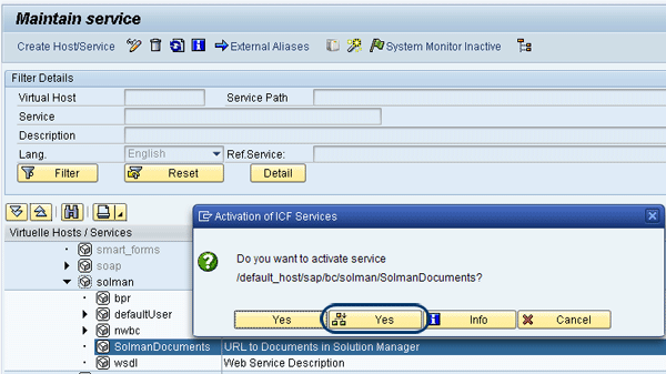 Return to the Maintain service page. Select the services of hierarchy type Service and navigate to node /default_host/sap/bc/solman/SolmanDocuments. Right-click SolmanDocuments and select Activate Service in the context menu (Figure 29). Confirm the service activation by clicking the second Yes button, as this is the option that activates the parent service and all the child services underneath it (Figure 30).