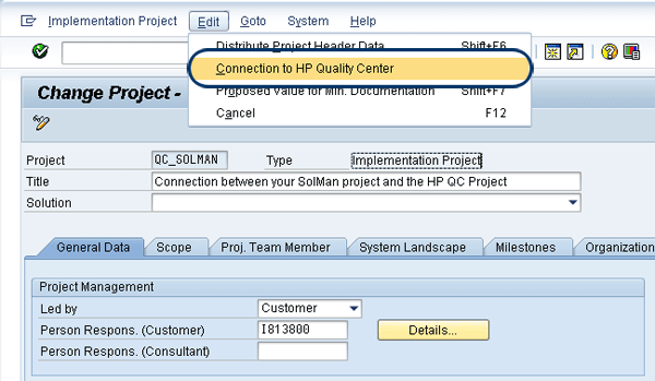Then, select Connection to HP Quality Center from the Edit drop-down menu (Figure 32). A dialog box with all the data required for the connection to SAP Quality Center appears. Expand Communication Data and check the communication user data. You can also specify a different default user if you wish (as I said earlier, this is not very common). Select the project in SAP Quality Center to which you want to establish the connection. Save your work.